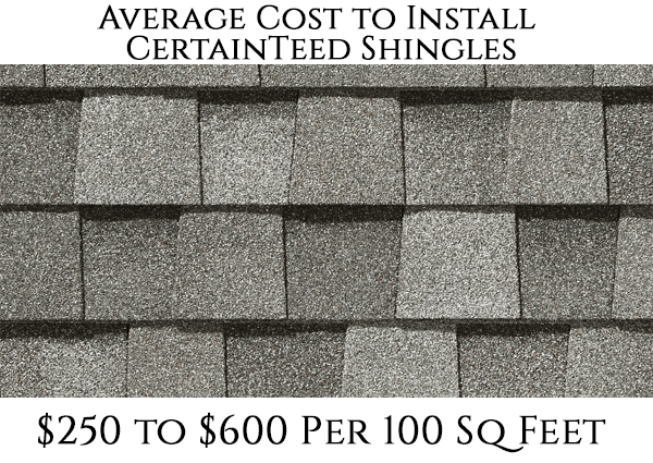 Certainteed lower-end traditional shingles cost between $250 and $300 per square (100 feet) installed. Their mid-range designer shingles cost between $400 and $450 per square installed and their luxury brand shingles cost between $400 and $600 per square installed.